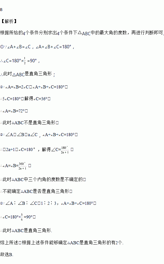 在下列条件中:①∠A+∠B=∠C;②∠A=∠B=2∠C;③∠A=∠B=a∠C;④∠A∶∠B∶∠C=1∶2∶3,能确定△ABC为直角三角形的条件有( )