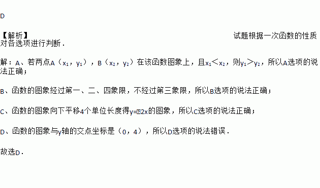 对于一次函数y=-2x+4,下列结论错误的是( )