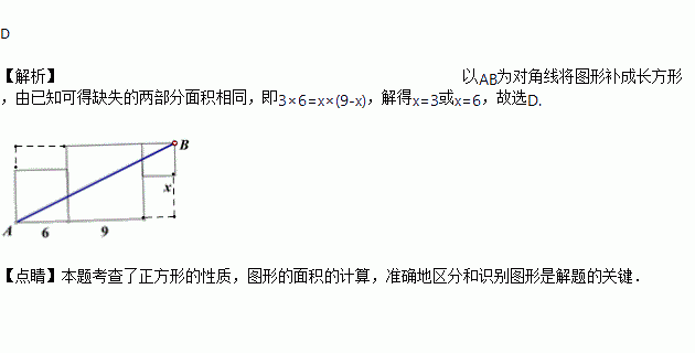 如图是由三个边长分别为6、9、x的正方形所组成的图形,若直线AB将它分成面积相等的两部分,则的值是( )