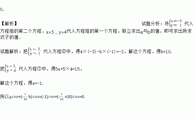甲、乙两人共同解方程组由于甲看错了方程①中的a,得到方程组的解为乙看错了方程②中的b,得到方程组的解为试计算a2 013+(-b)2 014.