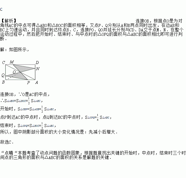 如图,矩形ABCD中,AB=4,BC=2,O为对角线AC的中点,点P、Q分别从A和B两点同时出发,在边AB和BC上匀速运动,并且同时到达终点B、C,连接PO、QO并延长分别与CD、DA交于点M、N.在整个运动过程中,图中阴影部分面积的大小变化情况是( )