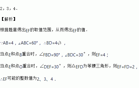 如图,在菱形ABCD中,对角线AC、BD相交于点O,点E是线段BO上的一个动点,点F为射线DC上一点,若∠ABC=60°,∠AEF=120°,AB=4,则EF可能的整数值是_____.