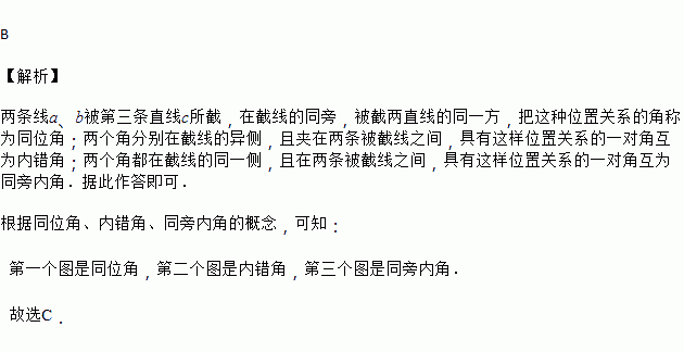 两条直线被第三条直线所截,就第三条直线上的两个交点而言形成了“三线八角”.为了便于记忆,同学们可仿照图用双手表示“三线八角”(两大拇指代表被截直线,食指代表截线).下列三幅图依次表示( )