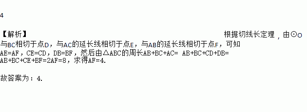 如图,△ABC的周长为8,⊙O与BC相切于点D,与AC的延长线相切于点E,与AB的延长线相切于点F,则AF的长为_____.