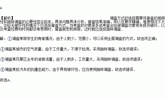 下列四种调查:①调查某班学生的身高情况;②调查某城市的空气质量;③调查某风景区全年的游客流量;④调查某批汽车的抗撞击能力,其中适合用全面调查方式(普查)的是( )