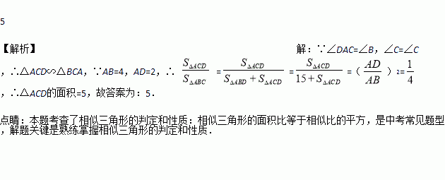 如图,D是△ABC的边BC上一点,AB=4,AD=2,∠DAC=∠B.如果△ABD的面积为15,那么△ACD的面积为________.