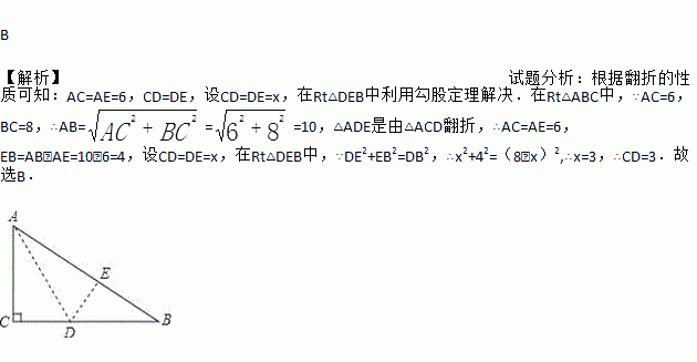 如图,有一块直角三角形纸片,两直角边AC=6cm,BC=8cm.现将直角边AC沿直线AD折叠,使它落在斜边AB上,且与AE重合,则CD等于( )