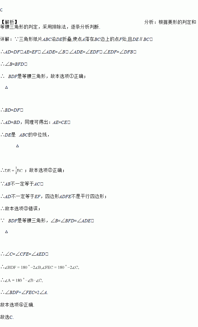 如图,将△ABC沿DE折叠,使点A落在BC边上的点F处,且DE∥BC,下列结论中,一定正确的个数是( )