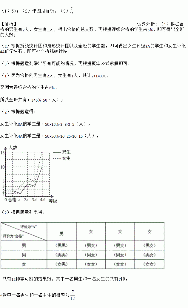 (1)50;(2)作图见解析,(3) 【解析】试题分析:(1)根据合格的男生有2人,女生有1人,得出合格的总人数,再根据评级合格的学生占6%,即可得出全班的人数; (2)根据折线统计图和扇形统计图以及全班的学生数,即可得出女生评级3A的学生和女生评级4A的学生数,即可补全折线统计图; (3)根据题意列举出所有可能的情况,再根据概率公式求解即可. (1)因为合格的男生有2人,...