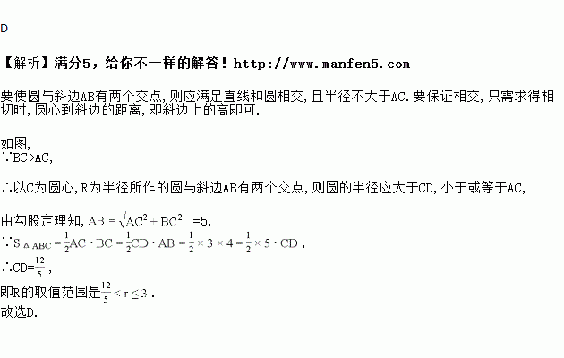 已知中,,,,以为圆心,为半径的圆与边有两个交点,则的取值范围是( )