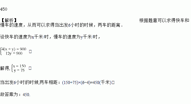 一列快车从甲地驶往乙地,一列慢车从乙地驶往甲地,两车同时出发,设慢车行驶的时间为x小时,两车之间的距离y千米,图中的折线表示y与x之间的函数关系,则出发6小时的时候,甲、乙两车相距_____千米.