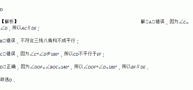 如图所示,已知直线BF、CD相交于点O,∠D=40°,下面判定两条直线平行正确的是( )