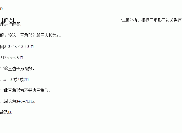 已知不等边三角形的一边等于5,另一边等于3,若第三边长为奇数,则周长等于( )