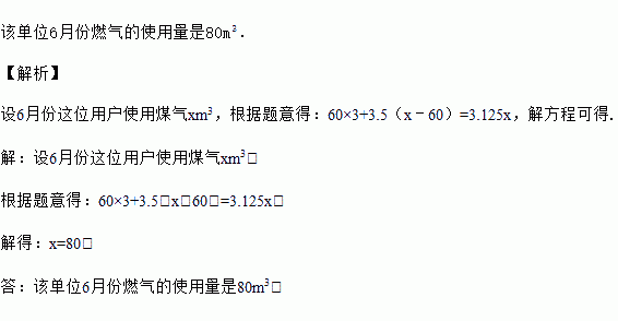 某城市实施阶梯燃气费的收费方式,当用户使用的燃气量不超过60立方米时,按每立方米3元收费;如果超过60立方米,超过部分按每立方米3.5元收费,已知某单位6月份燃气费平均每立方米费用为3.125元,求该单位6月份燃气的使用量.