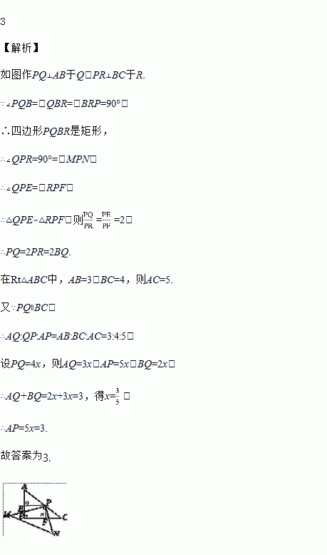 如图,在Rt△ABC中,∠ABC=90°,AB=3,BC=4,Rt△MPN,∠MPN=90°,点P在AC上,PM交AB于点E,PN交BC于点F,当PE=2PF时,AP=______.