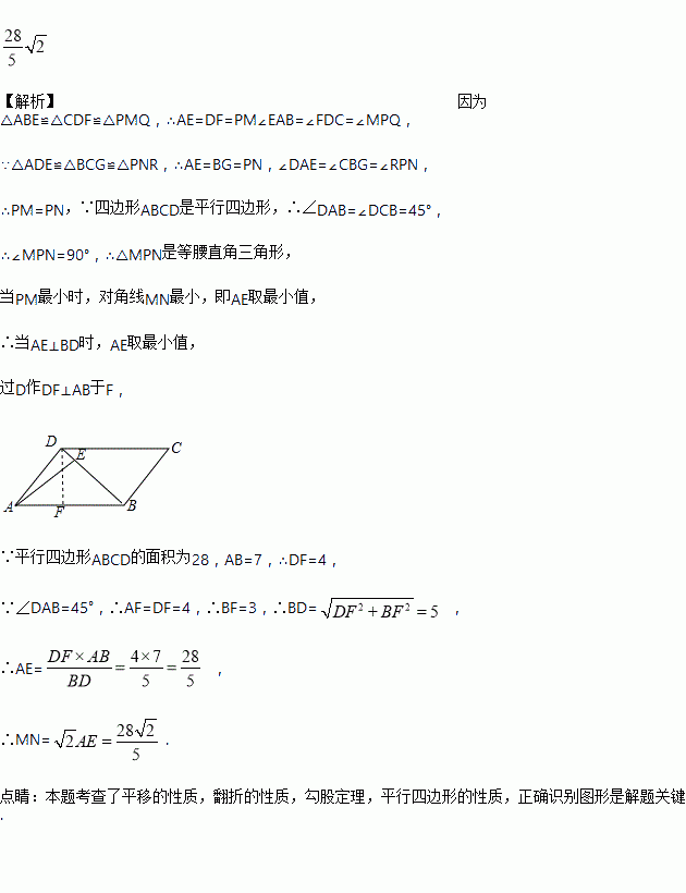 如图,面积为28的平行四边形纸片ABCD中,AB=7,∠BAD=45°,按下列步骤进行裁剪和拼图.