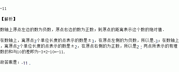 数轴上A点表示原点左边距离原点3个单位长度、B点在原点右边距离原点2个单位长度,那么两点所表示的有理数的和与10的差是________