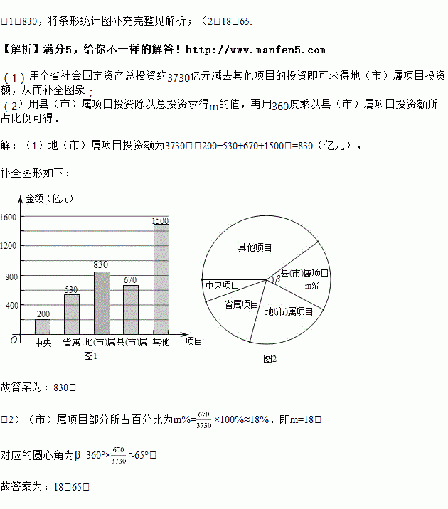 (1)在图1中,先计算地(市)属项目投资额为 亿元,然后将条形统计图补充完整;