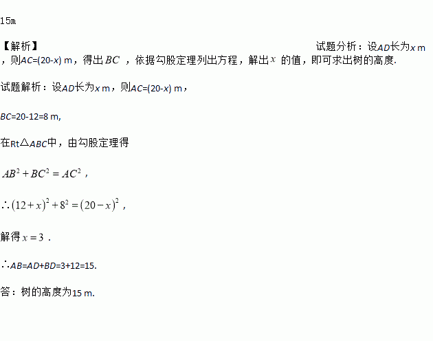 如图,AB为一棵大树(垂直于地面,即AB⊥BC),在树上距地面12m的D处有两只猴子,它们同时发现地面上的C处有一筐水果,一只猴子从D处向上爬到树顶A处,再利用拉在A处的滑绳AC,滑到C处,另一只猴子从D处滑到地面B,再由B跑到C,已知两猴子经过的路程都是20m,求树高AB.