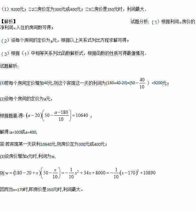 ij±ö¹ÝÓÐ50¸ö·¿¼ä¹©Óο;Óס£¬µ±Ã¿¸ö·¿¼äÿÌìµÄ¶¨¼ÛΪ180Ԫʱ£¬·¿¼ä»áÈ«²¿×¡Âú£»µ±Ã¿¸ö·¿¼äÿÌìµÄ¶¨¼ÛÿÔö¼Ó10Ԫʱ£¬¾Í»áÓÐÒ»¸ö·¿¼ä¿ÕÏУ®Èç¹ûÓο;Óס·¿¼ä£¬±ö¹ÝÐè¶Ôÿ¸ö·¿¼äÿÌìÖ§³ö20ÔªµÄ¸÷ÖÖ·ÑÓã®