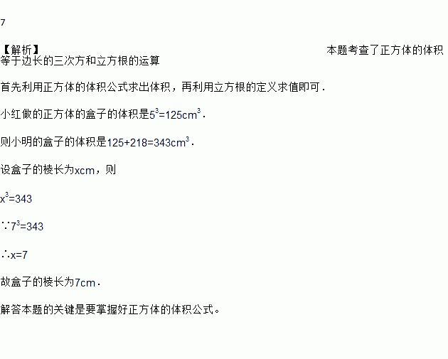 小红做了棱长为5cm的一个正方体盒子,小明说:“我做的盒子的体积比你的大218 cm.”则小明的盒子的棱长为 cm.