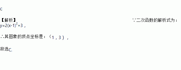 C 【解析】∵二次函数的解析式为:y=2(x-1)2+3, ∴其图象的顶点坐标是:(1,3), 故选C.