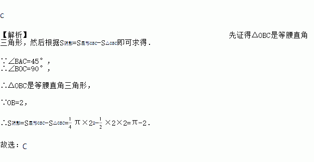 如图,点A,B,C在⊙O上,若∠BAC=45°,OB=2,则图中阴影部分的面积为( )