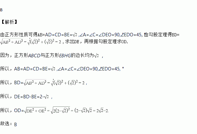 ,正方形EBHG的顶点E恰好落在正方形ABCD的对角线BD上,边EG与CD相交于点O,则OD的长为![]()