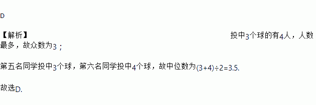 D 【解析】投中3个球的有4人,人数最多,故众数为3; 第五名同学投中3个球,第六名同学投中4个球,故中位数为(3+4)÷2=3.5. 故选D.