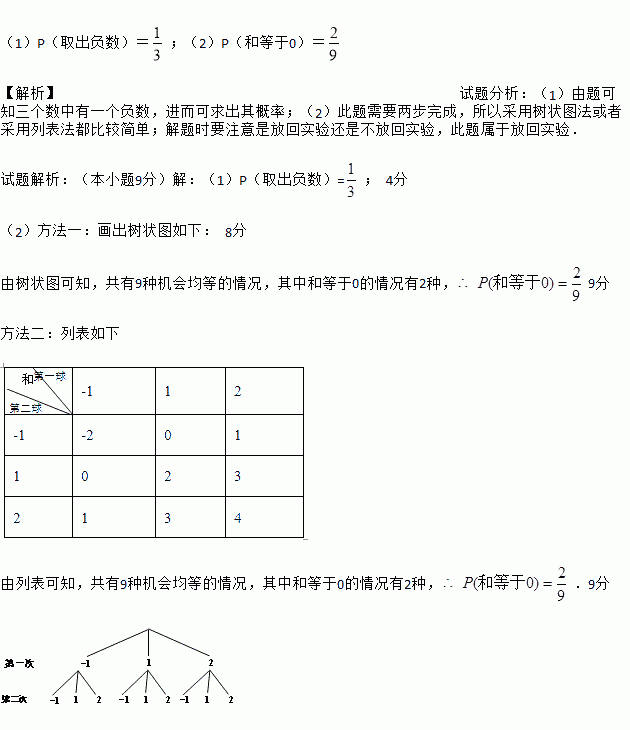 (1)P(取出负数)=;(2)P(和等于0)= 【解析】试题分析:(1)由题可知三个数中有一个负数,进而可求出其概率;(2)此题需要两步完成,所以采用树状图法或者采用列表法都比较简单;解题时要注意是放回实验还是不放回实验,此题属于放回实验. 试题解析:(本小题9分)【解析】 (1)P(取出负数)=; 4分 (2)方法一:画出树状图如下: 8分 由树状图可知,共有9种机会均...