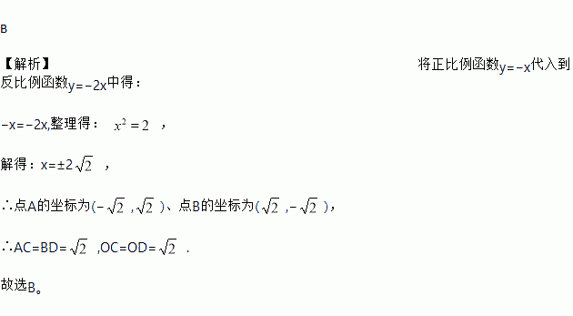 B 【解析】将正比例函数y=?x代入到反比例函数y=?2x中得: ?x=?2x,整理得: , 解得:x=±2 , ∴点A的坐标为(?,)、点B的坐标为(,?), ∴AC=BD= ,OC=OD= . 故选B。