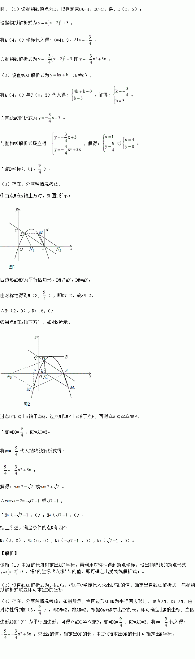 如图,矩形OABC在平面直角坐标系xOy中,点A在x轴的正半轴上,点C在y轴的正半轴上,OA=4,OC=3,若抛物线的顶点在BC边上,且抛物线经过O,A两点,直线AC交抛物线于点D.