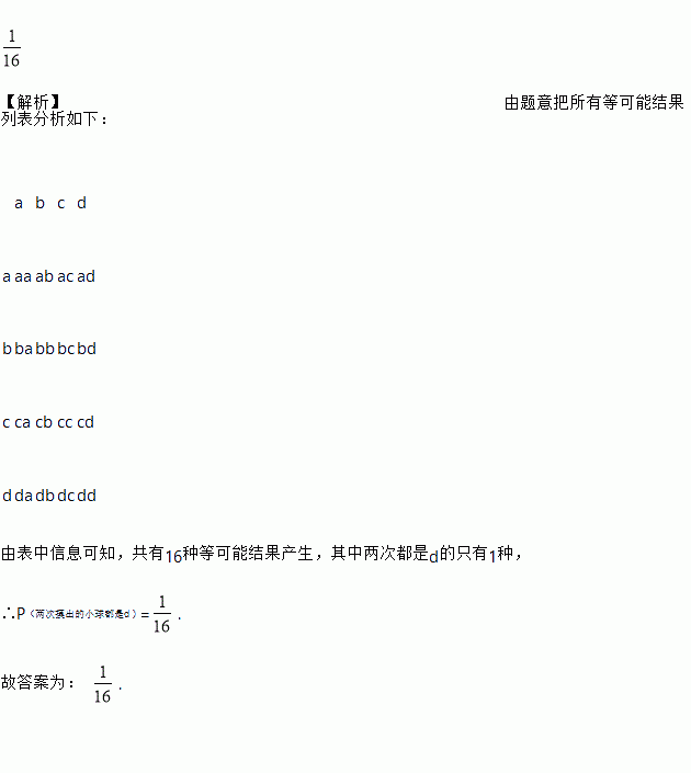 在一个不透明的口袋中,有四个完全相同的小球,把它们分别标号为a、b、c、d,随机地摸取一个小球记下标号后放回,再随机地摸取一个小球记下标号,则两次摸取的小球标号都是d的概率为______.