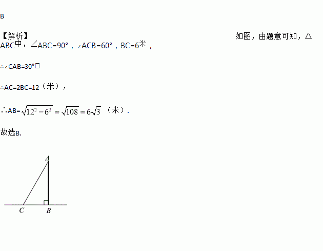 如图,AC是电线杆的一根拉线,测得BC=6米,∠ACB=60°,则AB的长为( )