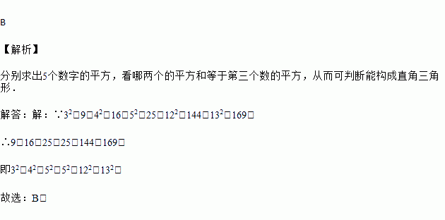 长度分别为 3 , 4 , 5 , 12 ,13 的五根木棒能搭成(首尾连接)直角三角形的个数为 ( )