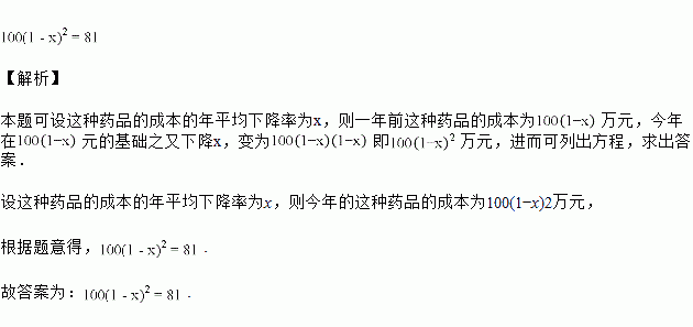 某药厂两年前生产某种药品每吨的成本是万元,现在生产这种药品每吨的成本为万元.设这种药品的成本的年平均下降百分率为,则可列方程为________.