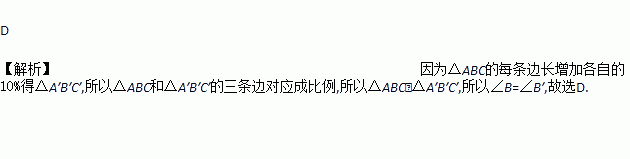 若△ABC的每条边长增加各自的10%得△A′B′C′,则∠B′的度数与其对应角∠B的度数相比( )