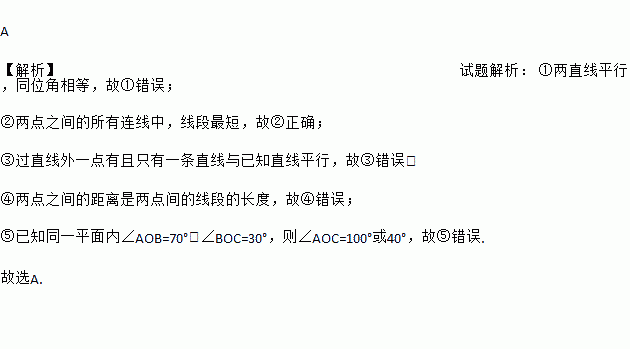 A 【解析】试题解析: ①两直线平行,同位角相等,故①错误; ②两点之间的所有连线中,线段最短,故②正确; ③过直线外一点有且只有一条直线与已知直线平行,故③错误; ④两点之间的距离是两点间的线段的长度,故④错误; ⑤已知同一平面内∠AOB=70°,∠BOC=30°,则∠AOC=100°或40°,故⑤错误. 故选A.