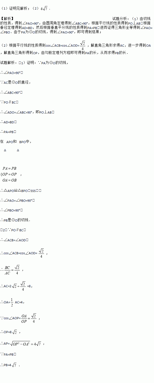 (2)当BC=2,cos∠AOD=时,求PB的长.