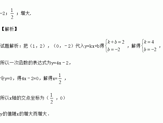 如图是y=kx+b的图象,则b= ,与x轴的交点坐标为 ,y的值随x的增大而 .