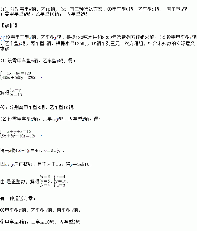 (1)若全部水果都用甲、乙两种车型来运送,需运费8200元,问分别需甲、乙两种车型各几辆?