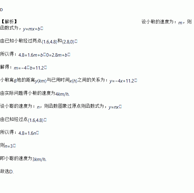 小敏从A地出发向B地行走,同时小聪从B地出发向A地行走,如图所示,相交于点P的两条线段l1、l2分别表示小敏、小聪离B地的距离y(km)与已用时间x(h)之间的关系,则小敏、小聪行走的速度分别是( )