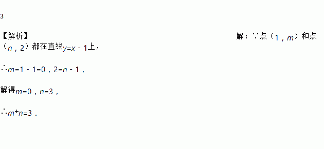 3 【解析】【解析】 ∵点(1,m)和点(n,2)都在直线y=x﹣1上, ∴m=1﹣1=0,2=n﹣1, 解得m=0,n=3, ∴m+n=3.