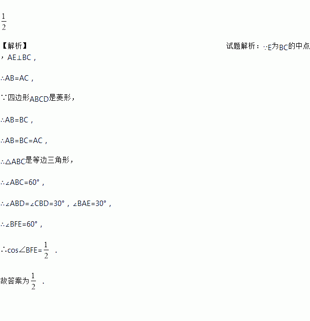 如图,BD是菱形ABCD的对角线,AE⊥BC于点E,交BD于点F,且E为BC的中点,则cos∠BFE的值是_________.