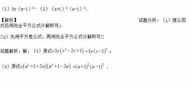 (1)3y(x-1)2 ;(2)(a+1)2(a-1)2. 【解析】试题分析:(1)提公因式后用完全平方公式分解即可; (2)先用平方差公式,再用完全平方公式分解即可. 试题解析:【解析】 (1)原式==; (2)原式==.