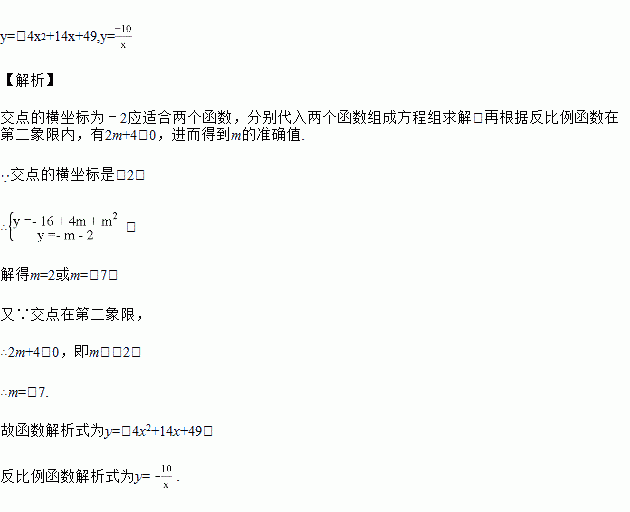已知函数y=-4x2-2mx+m2与反比例函数y=的图象在第二象限内的一个交点的横坐标是-2,求此两个函数的解析式.
