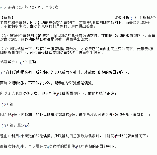 (1)正确(2)能(3)能,至少4次 【解析】试题分析:(1)根据3个奇数的和是奇数,所以翻动的总张数为奇数时,才能使3张牌的牌面都向下,而每次翻动2张,不管翻多少次,翻动的总张数都是偶数,进而得出答案; (2)根据4个奇数的和是偶数,所以翻动的总张数为偶数时,才能使4张牌的牌面都向下,而每次翻动2张,故翻动的总张数都是偶数,进而得出答案; (3)可以试验一下,只有将一张牌翻动奇...