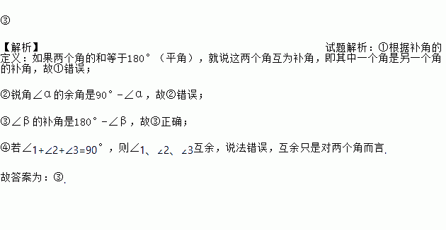 ③ 【解析】试题解析:①根据补角的定义:如果两个角的和等于180°(平角),就说这两个角互为补角,即其中一个角是另一个角的补角,故①错误; ②锐角∠α的余角是90°-∠α,故②错误; ③∠β的补角是180°-∠β,故③正确; ④若∠1+∠2+∠3=90°,则∠1、∠2、∠3互余,说法错误,互余只是对两个角而言. 故答案为:③.