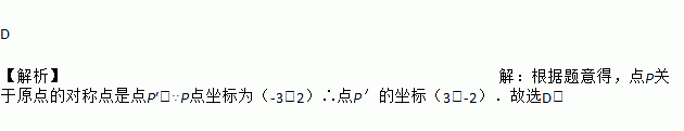 D 【解析】【解析】 根据题意得,点P关于原点的对称点是点P′,∵P点坐标为(-3,2)∴点P′的坐标(3,-2).故选D.
