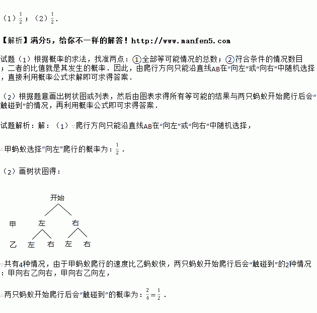如图,一条直线上有两只蚂蚁,甲蚂蚁在点A处,乙蚂蚁在点B处,假设两只蚂蚁同时出发,爬行方向只能沿直线AB在“向左”或“向右”中随机选择,并且甲蚂蚁爬行的速度比乙蚂蚁快.